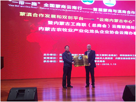 論壇上,蒙滇合作發(fā)展和雙創(chuàng)平臺(tái)——“云南內(nèi)蒙古中心”建設(shè)啟動(dòng)儀式暨內(nèi)蒙古工商聯(lián)(總商會(huì))云南聯(lián)絡(luò)處授牌、內(nèi)蒙古農(nóng)牧業(yè)產(chǎn)業(yè)化龍頭企業(yè)協(xié)會(huì)云南辦事處授牌儀式同期舉行。內(nèi)蒙古農(nóng)牧業(yè)廳黨組成員、總農(nóng)藝師王雨峰授予云南省內(nèi)蒙古商會(huì)“內(nèi)蒙古農(nóng)牧業(yè)產(chǎn)業(yè)化龍頭企業(yè)協(xié)會(huì)云南辦事處”的牌匾,內(nèi)蒙古農(nóng)牧業(yè)產(chǎn)業(yè)化龍頭企業(yè)協(xié)會(huì)執(zhí)行會(huì)長林永亮宣讀辦事處成立文件,由云南省內(nèi)蒙古商會(huì)會(huì)長徐國林擔(dān)任辦事處主任。