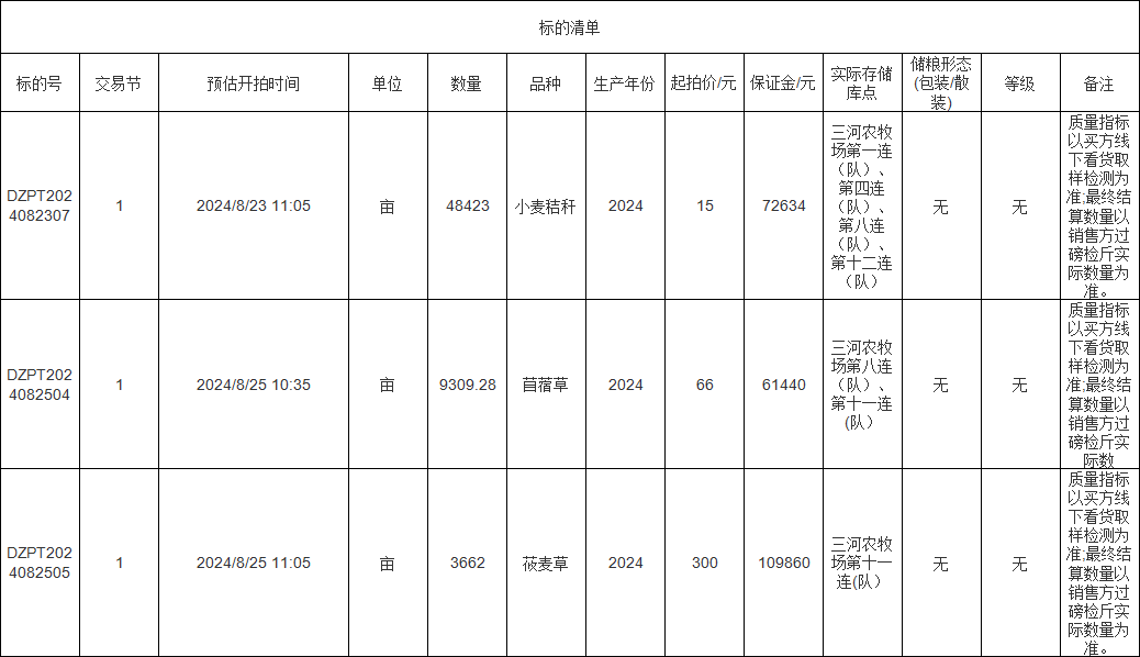 轉(zhuǎn)讓標的為苜蓿草、莜麥草、小麥秸稈,涉及面積苜蓿草9309.28畝、莜麥草3662畝、小麥秸稈48423畝,意向受讓方在競標前應(yīng)自行對標的預(yù)估數(shù)量和質(zhì)量情況進行充分了解,交易標的均以實際狀況為準。標的存放地位于三河農(nóng)牧場,詳情見標的清單: