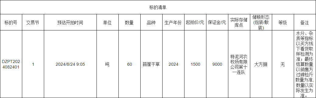 轉(zhuǎn)讓標(biāo)的為苜蓿干草60噸,標(biāo)的存放地位于特泥河農(nóng)牧場有限公司第十一連隊(duì),詳情見標(biāo)的清單: