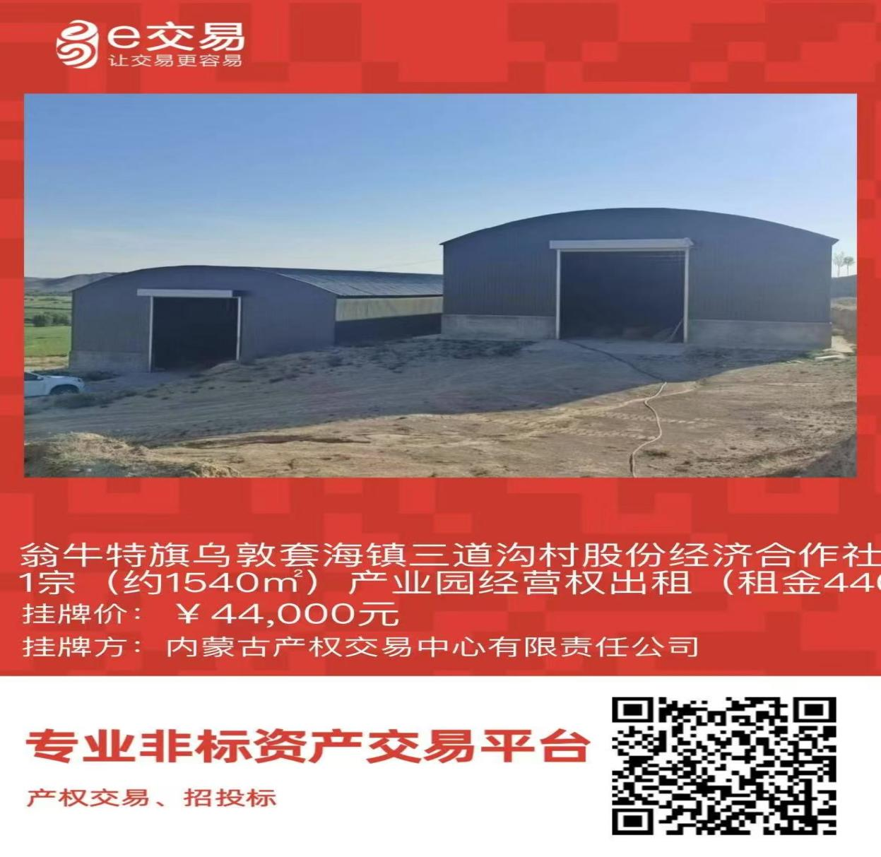 翁牛特旗烏敦套海鎮(zhèn)三道溝村股份經(jīng)濟(jì)合作社1宗(約1540㎡)產(chǎn)業(yè)園經(jīng)營權(quán)出租(租金44000元/年,租期5年)
