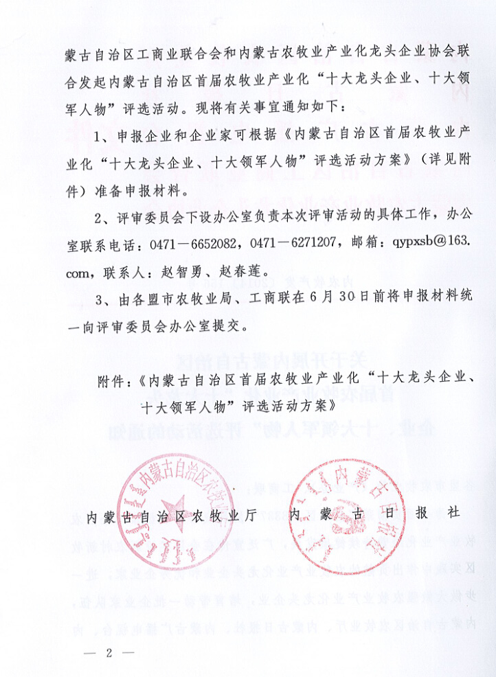 關(guān)于開展內(nèi)蒙古自治區(qū)首屆農(nóng)牧業(yè)產(chǎn)業(yè)化“十大龍頭企業(yè)、十大領(lǐng)軍人物”評(píng)選活動(dòng)的通知