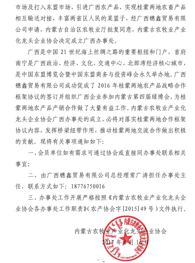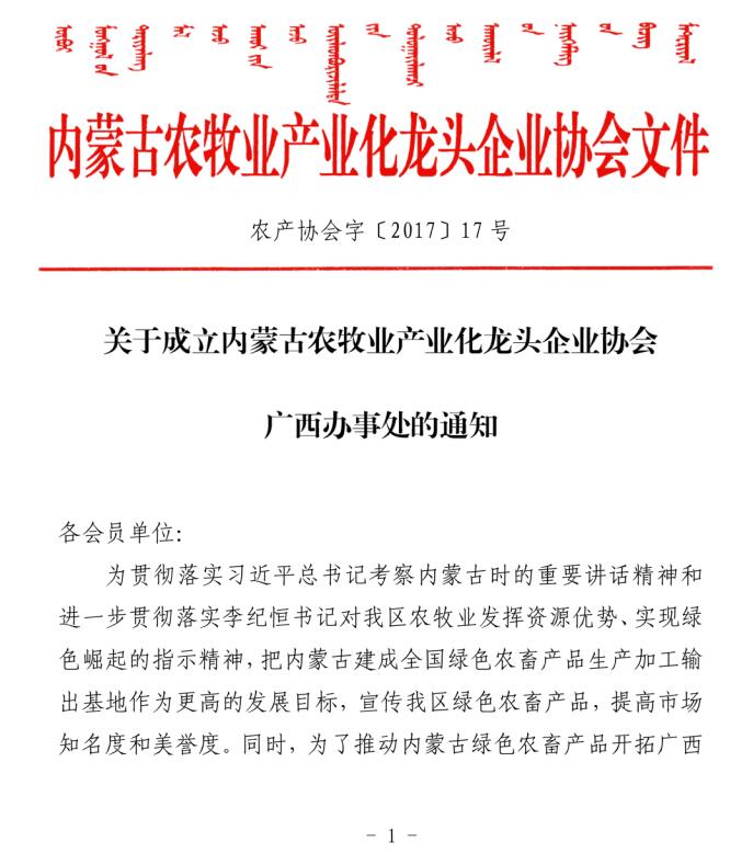 關(guān)于成立內(nèi)蒙古農(nóng)牧業(yè)產(chǎn)業(yè)化龍頭企業(yè)協(xié)會(huì)廣西辦事處的通知