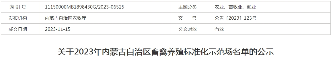 標題:關于2023年內(nèi)蒙古自治區(qū)畜禽養(yǎng)殖標準化示范場名單的公示
