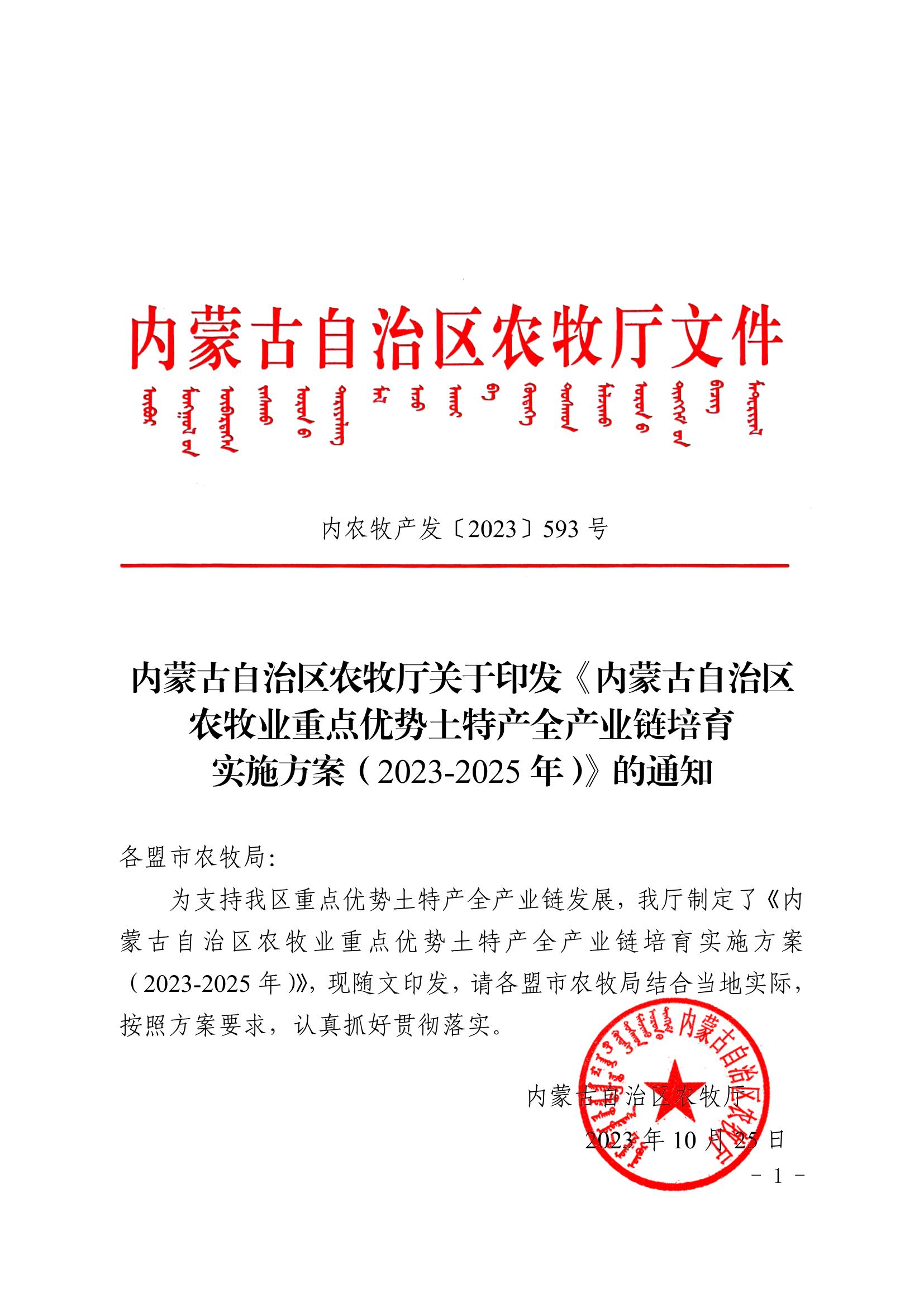 標(biāo)題:內(nèi)蒙古自治區(qū)農(nóng)牧廳關(guān)于印發(fā)《內(nèi)蒙古自治區(qū) 農(nóng)牧業(yè)重點(diǎn)優(yōu)勢土特產(chǎn)全產(chǎn)業(yè)鏈培育 實(shí)施方案(2023-2025年)》的通知