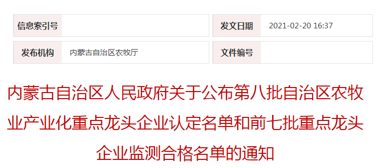 企業(yè)名稱:內(nèi)蒙古自治區(qū)人民政府關(guān)于公布第八批自治區(qū)農(nóng)牧業(yè)產(chǎn)業(yè)化重點(diǎn)龍頭企業(yè)認(rèn)定名單和前七批重點(diǎn)龍頭企業(yè)監(jiān)測合格名單的通知