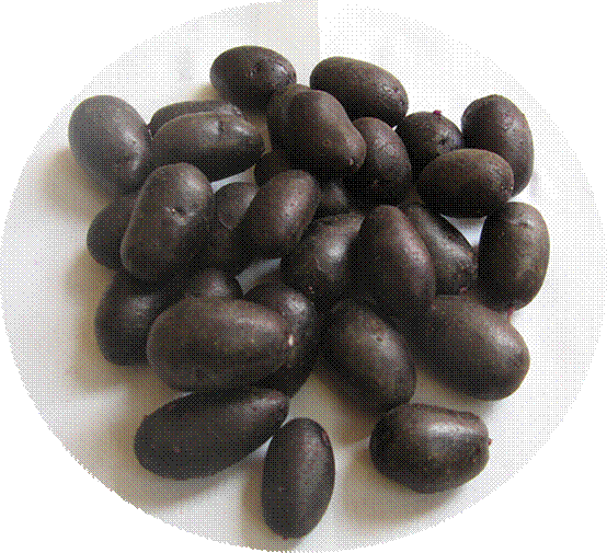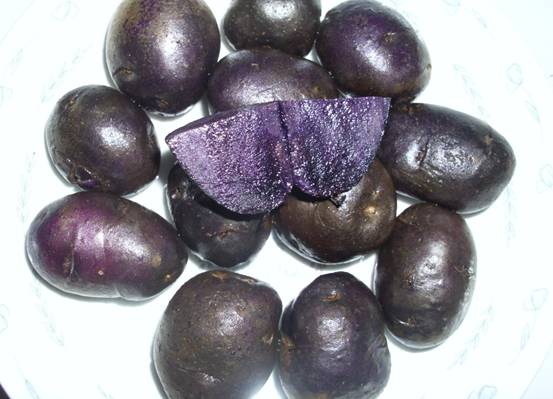 黑美人經(jīng)甘肅省農(nóng)業(yè)科學(xué)院農(nóng)業(yè)測(cè)試中心檢測(cè)(NO.R41-AP-2006)測(cè)定淀粉含量12%,每千克黑美人中含粗淀粉119.7克,還原糖3.49克,每百克黑美人中含蛋白質(zhì)2.45克,脂肪0.1克,每百克黑美人中微量元素及維生素含量為:碳水化合物16.5克,維生素C21.7毫克。其黑紫色的原因是富含Delphindin(紫色)花青素,經(jīng)北京譜尼理化分析測(cè)試中心檢測(cè)(檢測(cè)報(bào)告編號(hào)為:SH061204-014)其花青素含量為每百克4.28毫克。該品種除營(yíng)養(yǎng)豐富外,其富含的花青素還具有抗癌、抗衰老、美容和防止高血壓等多種保健作用