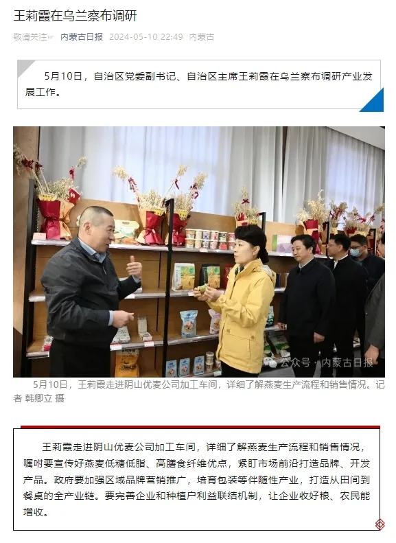 內蒙古自治區(qū)主席王莉霞在烏蘭察布市調研,深入陰山優(yōu)麥了解燕麥產業(yè)發(fā)展情況